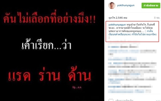 กลายเป็นประเด็นร้อนแรงบนโลกออนไลน์ส่งท้ายปีเก่าเลยทีเดียว หลังจากนักแสดงสาวช่อง 7 หยก ธัญยกันต์ โพสต์ข้อความลงอินสตาแกรมสุดแซ่บกับประโยคเด็ด "คันไม่เลือกที่อย่าง-ึง แรด ร่าน ด้าน" ซึ่งหลังจากที่เจ้าตัวได้โพสต์ไปนั้น ปรากฏว่าเพื่อนนักแสดงจำนวนมากได้เข้ามาแสดงความคิดเห็นพร้อมกับให้กำลังใจกันยกใหญ่ พร้อมกับบอกว่าให้แฉ! และแท็กชื่อไอจีไปเลยไหมว่าเป็นใคร