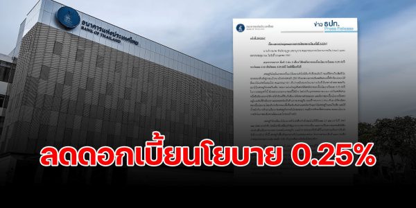 กนง. มติ 5 ต่อ 2 ลดดอกเบี้ยนโยบาย 0.25% ต่อปี